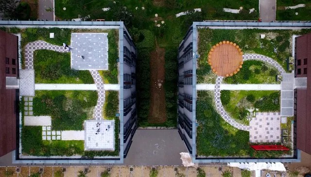 ▼沣西新城西部云谷屋顶景观绿化:屋顶绿化在降雨时可吸收部分雨水。
